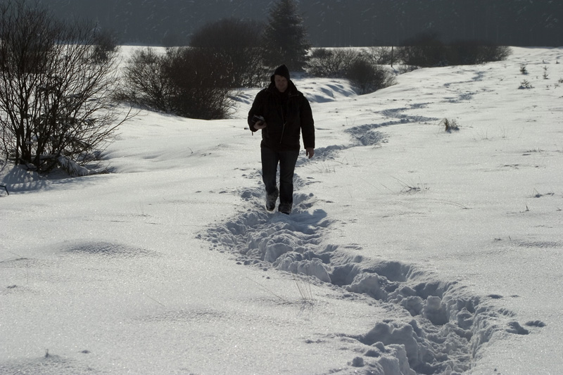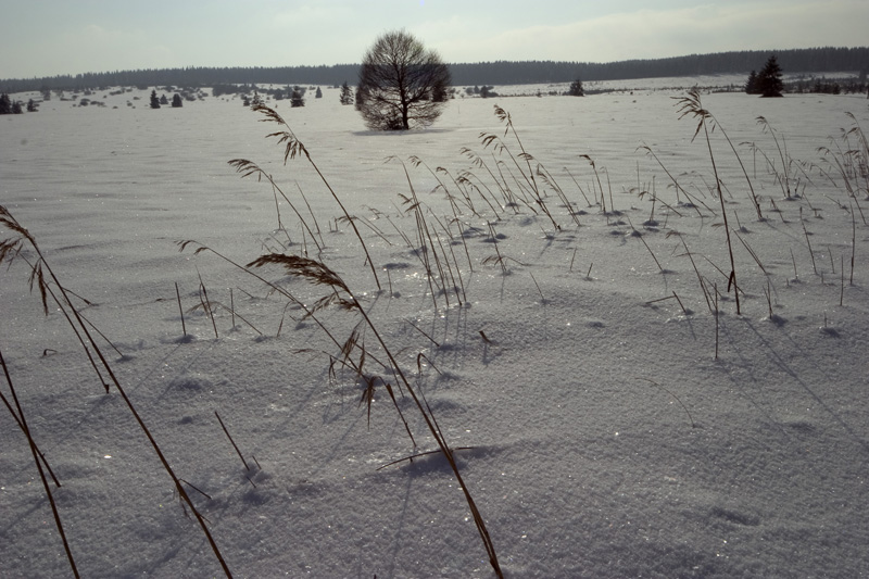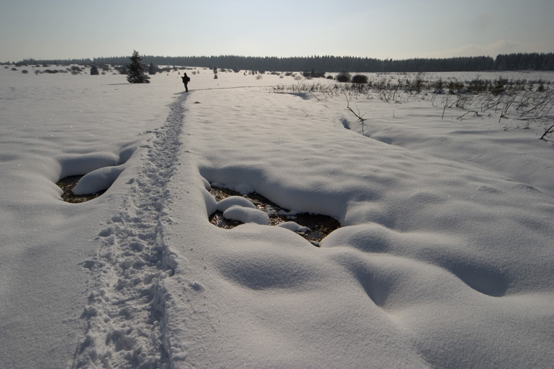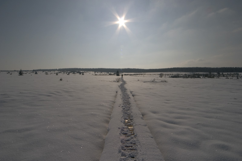 De klassieke houten paden boven het veen zijn soms zo goed als onzichtbaar. Hier en daar is het oppassen geblazen om niet ineens tot de heupen in de sneeuw te schieten bij het volgen van de sporen van voorgaande wandelaars die naast het pad liepen. ![]() |