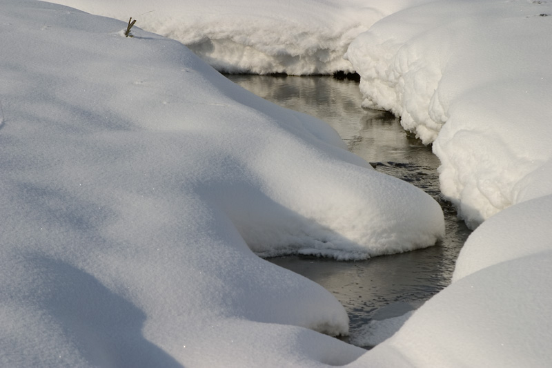 De vele kleine stroompjes onder de sneeuw verenigen zich tot een fotogeniek riviertje. ![]() |