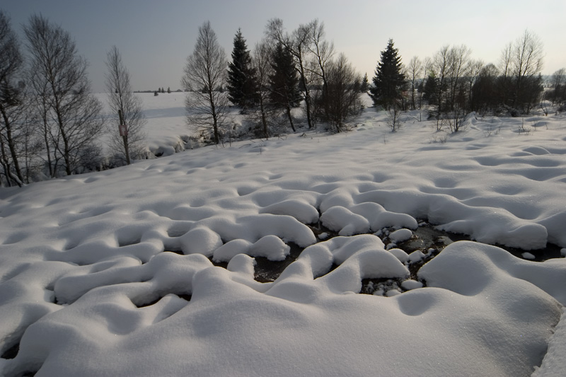 Alleen langs oevers is de echte dikte van het sneeuwpakket zichtbaar. De sneeuw hangt tot op millimeters boven het stromende water. ![]() |